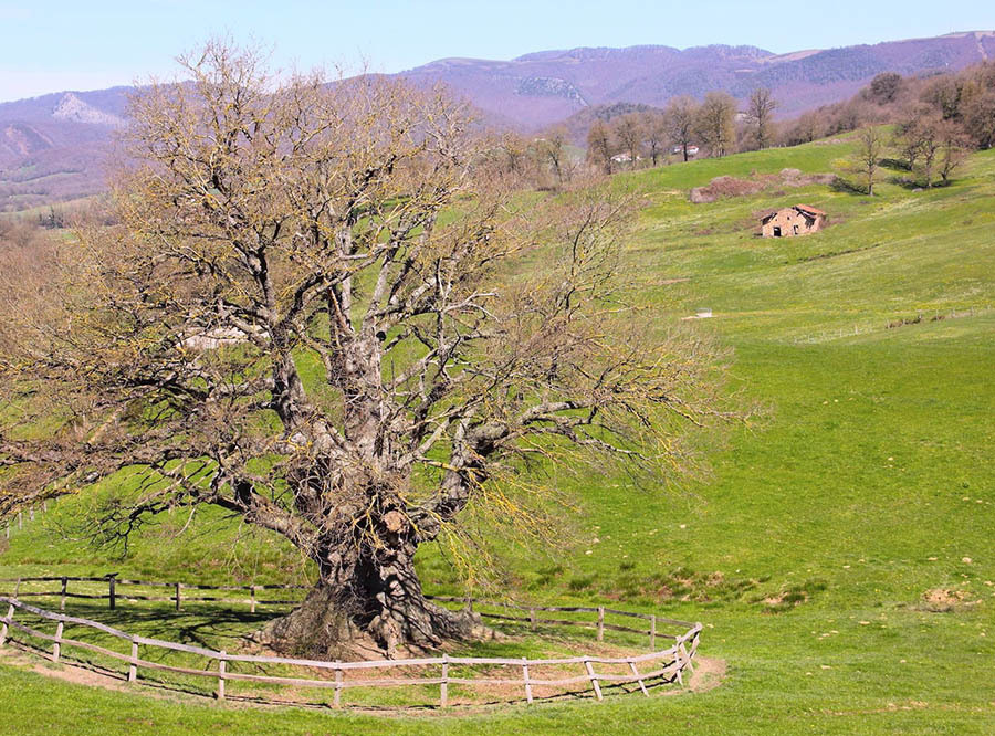 Este increíble árbol se encuentra situado en una pradera junto a la vega de la pedanía de Orkingo, está catalogado entre los 47 árboles monumentales de Navarra. Llama la atención desde lejos por su enorme presencia.